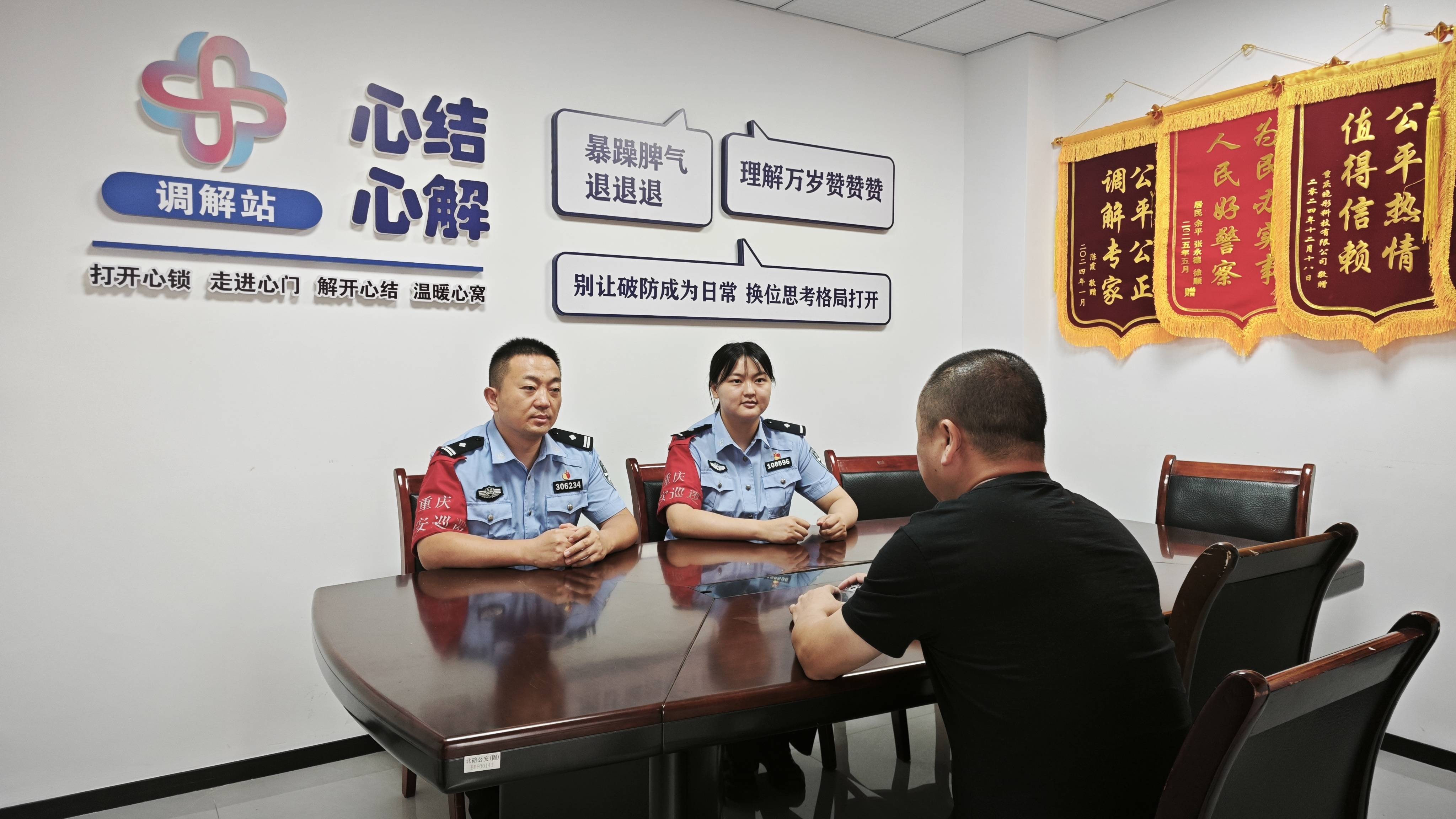 图为北碚区公安分局朝阳派出所民警正在开展调解工作。(受访者供图)“哟,‘扭到费’来了,快坐!”“费警官,上次多亏你提醒,我才没上当!”这样的招呼声,常常回响在朝阳派出所民警费俊峰的耳边。